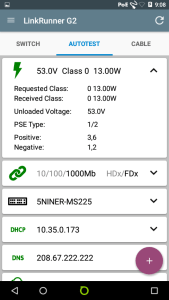 Expanding the POE test reveals the voltage and wattage present and also the POE class. In this example you will see that POE was available on the tested switchport with an available 53 volts and 13 watts.