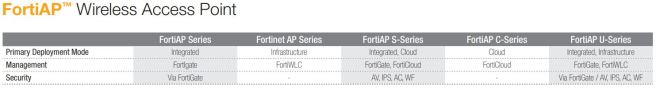 Fortinet offers three different management options under it’s Enterprise Secure Wifi solution; FortiGate, Cloud, or dedicated controller, and five different AP lines that fall into one or more of those management options.