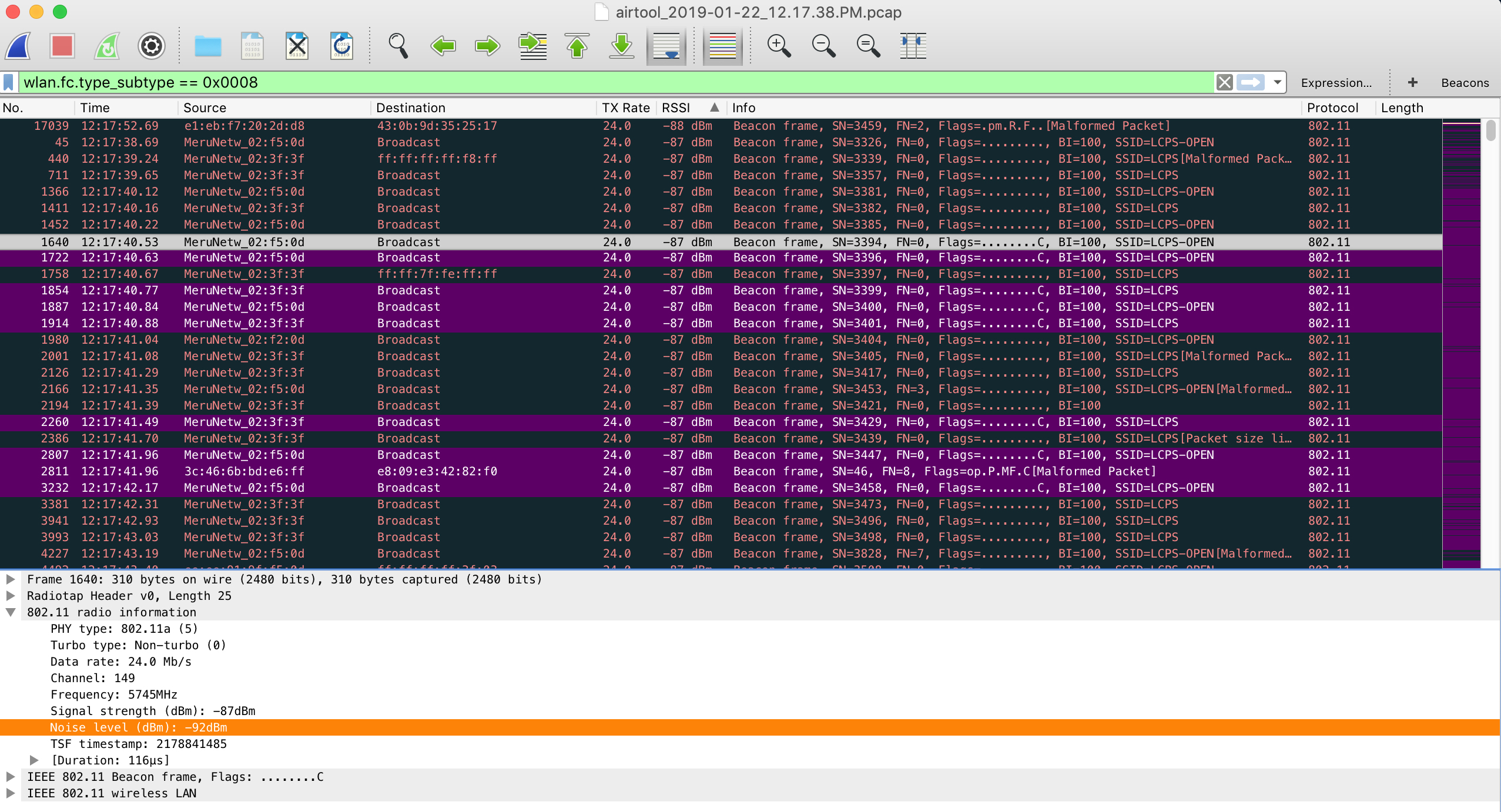 It is no secret at this point that I maintain a very large Single Channel Architecture/Virtual Cell wireless network. From time to time there are certain nuances that force our hand into making adjustments to the wireless network, which really is no different than any other network, SCA or MCA. Since we do primarily use a single channel throughout our instructional spaces, a single, identical, BSSID is seen by all clients within a Virtual Cell. Recently I was troubleshooting network performance issues on Chromebooks and found that they were constantly performing four way handshakes, several times per minute. Other devices in the area, including my Mac, did not experience the same problem. I decided to pull some pcaps to see what I could find. I ran Wireshark for a period of time then filtered out beacons (wlan.fc.type_subtype == 0x0008) and sorted them by lowest to highest RSSI. What I found next started to pull things together from several other recent troubleshooting sessions. I found that my beacons, all from the same BSSID, had valid FCS and were being received with RSSI into the high -80s (dBm). This only left room for an SNR in the single digits.