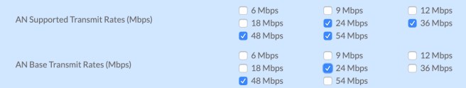 TX power is already reduced to a level that provides proper overlap between classrooms to satisfy requirements. Increasing the minimum base transmit rate to 36 Mbps was done first but did not yield the results that I wanted to see. I then increased the minimum base transmit rate to 48 Mbps (also leaving the supported rates of 24 and 36 Mbps) and ran another pcap.