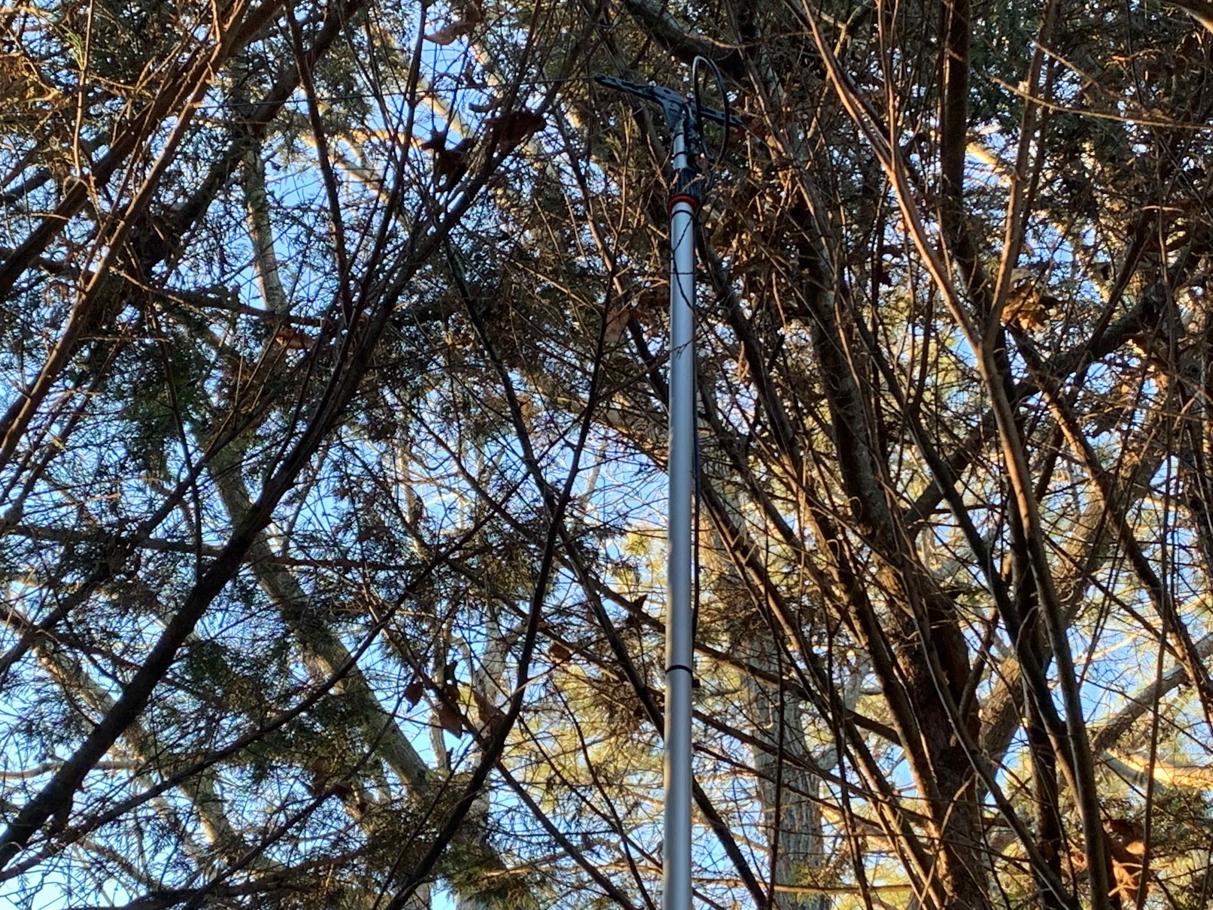 After assembly I attached the center “T” to my telescoping fiberglass pole and set it to a height of 15 feet.  I mounted the fiberglass pole to a fence in my back yard which runs parallel with some evergreen trees that boarder my property.  The pole extends upwards into the evergreen trees with it’s wire “legs” making an inverted “V”  with the ends extending out and mounted roughly 3 feet off of the ground.  This position is what I found to work best during testing after installation.  Results may vary and should be tested to meet your needs.